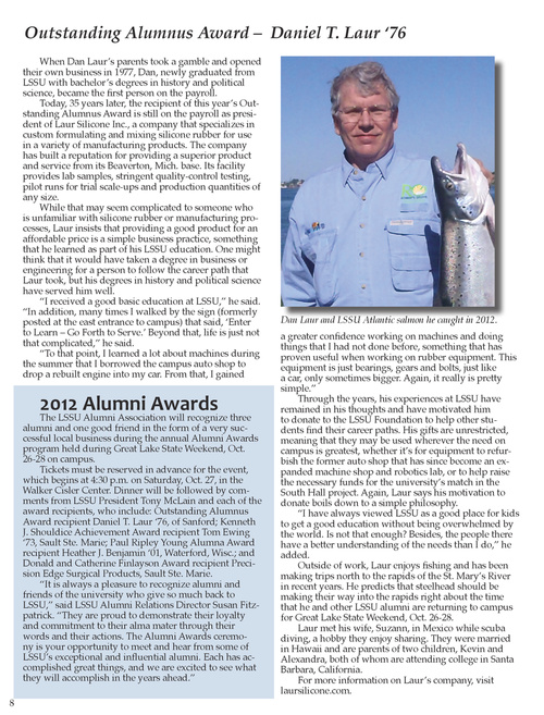 alumni and one good friend in the form of a very successful local business during the annual Alumni Awards program held during Great Lake State Weekend, Oct. 26-28 on campus. Tickets must be reserved in advance for the event, which begins at 4:30 p.m. on Saturday, Oct. 27, in the Walker Cisler Center. Dinner will be followed by comments from LSSU President Tony McLain and each of the award recipients, who include: Outstanding Alumnus Award recipient Daniel T. Laur ‘76, of Sanford; Kenneth J. Shouldice Achievement Award recipient Tom Ewing ‘73, Sault Ste. Marie; Paul Ripley Young Alumna Award recipient Heather J. Benjamin ‘01, Waterford, Wisc.; and Donald and Catherine Finlayson Award recipient Precision Edge Surgical Products, Sault Ste. Marie. “It is always a pleasure to recognize alumni and friends of the university who give so much back to LSSU,” said LSSU Alumni Relations Director Susan Fitzpatrick. “They are proud to demonstrate their loyalty and commitment to their alma mater through their words and their actions. The Alumni Awards ceremony is your opportunity to meet and hear from some of LSSU’s exceptional and influential alumni. Each has accomplished great things, and we are excited to see what they will accomplish in the years ahead.” 8