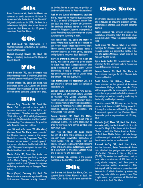 Rick Mahlmeister ’85, Mackinaw City, is a Todd Fritch ’93, Milford, Mass., has self-employed certified public accountant in been selected as the provost of American Mackinaw City. International College. In his new role, Fritch William Norris ’81, Silver City New Mexico, will be responsible for ensuring the academic works at the Department of Natural Sciences curriculum appropriately reflects the mission of at Western New Mexico University. His the college, as well as providing leadership to research has been publicized in many books. the faculty, and budget oversight. He is also a member of several organizations, Nate Kaczmarek ’97, Brimley, and his fishing including the American Association of Biology partner took home a $400 fishing award for Teachers, Natural Areas Association, and finishing first in the annual Bay of Pigs Fishing New Mexico Plant Society. Tournament sponsored by Eastern Upper Aaron Payment ’87, Sault Ste Marie, Peninsula police organizations at Brimley, was elected chairman of the Sault Tribe of Mich. Chippewa Indians. This is the second run as Michelle (Holt) Maas ’96, Sault Ste. Marie, chair for Payment, who served as tribal chair was selected by the Sault Area Public Schools from 2004-2008. as April’s Helpful Employee of the Month. Tom Pink ’85, Sault Ste Marie, played She is currently the Native American Advisor the part of a dead radio announcer in Lake at Sault Area Middle School. Michelle brings Superior State University’s production of positive energy to work with her each day and Kevin Kling’s “The Ice Fishing Play” last the students see her as a role model. March. Tom works in LSSU’s Public Relations Rachael McCoy ’98, Sault Ste. Marie, Office and is a freelance outdoor writer, writing and her husband, Peter Scornaiencki, have as a columnist for Michigan Outdoor News both obtained the postgraduate designation and a blogger for SUPthings.com. of Certified Chiropractic Sports Physician Mark Solberg ’86, Brimley, is the general (CCSP). To receive this certification, doctors manager at the Bay Mills Resort and Casino. must attend a minimum of 100 hours of a postgraduate program, and then pass a comprehensive written examination. This training will aid the doctors in prevention and treatments of athletic injuries by enhancing Joe Barone ’98, Sault Ste. Marie, Ont., just their diagnostic skills and patient care. The opened Bar1s Urban Fitness in Sault Ste. couple owns and practices at Bordertown Marie, Ont. Bar1s has all new state-of-theChiropractic in Sault Ste. Marie.
