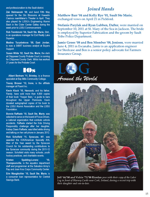 Albert Bertram ’11, Brimley, is a finance specialist at Bay Mills Community College. Tracey Brower ’12, Irons, is the affiliate manager at Fluent Inc. Kevin Kluck ’10, Hancock, and his father, Randy, have sold more than 4,800 copies of their book “Yooper Bars,” a guide to bars throughout the Upper Peninsula. Kevin donated autographed copies of his book to the LSSU Alumni Association and the LSSU Foundation. Bonnie Raffaele ’10, Sault Ste. Marie, was selected to serve on the board of Focus Driven, a national organization that combats vehicle accidents. Raffaele started the Kids Driving Responsibly challenge after her daughter, Kelsey Dawn Raffaele, was killed while driving and talking on her cell phone in January 2012. Rick Schofield ’11, Syracuse, NY, was awarded the IOA/American Specialty AHL Man of the Year award by the Syracuse Crunch for his outstanding contributions to the Syracuse community during the 2011-12 season. Schofield visits many schools, youth hockey practices, and charitable events. Kristen Spalding-Lorenz ’10, Thompsonville, is the aquatics department staff and programmer at the Salvation Army’s Ray and Joan Kroc Corps Community Center. Erin Wangbichler ’10, Sault Ste. Marie, is a consumer loan representative for Central Savings Bank. Jeff ‘66/’80 and Vickie ‘71/’88 Riordan pose with their copy of the Laker Log in front of Blarney Castle near Cork, Ireland, during a recent trip with their daughter and son-in-law.