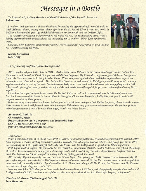To Roger Greil, Ashley Moerke and Geoff Steinhart of the Aquatic Research Laboratory I send you and your team a sincere thank-you for making the opportunity for my dad and I to catch Atlantic salmon, among other salmon species in the St. Mary’s River. I spent two weeks in DeTour, where my dad grew up, and fished the river near the mouth and the DeTour Light. The Atlantics are elegant and powerful on the end of the rod. I’m fascinated by them. What a fishing opportunity you’ve created and are sustaining for us anglers - Wow! Keep up the good work. On a side note, I saw you on the fishing show Hook’N’Look during a segment on your lab and the Atlantic stocking program. Jeremy Stevenson U.S. Army To engineering professor James Devaprasad: After I graduated from Lake State in 2004, I started with Fanuc Robotics in the Fanuc Toledo office in the Automotive Component and Industrial Paint Group as an Installation Engineer. My Computer Engineering and Robotics background from Lake State was crucial to being hired at Fanuc. When compared against other candidates, my hands-on experience with industrial robots set me apart…The Automotive Component and Industrial Paint group handles any paint, or spray application that is outside of the main line automotive body paint. We work with customers who spray fiberglass for bath tubs, powder for engine parts, porcelain glaze for sinks and toilets, as well as paint for personal watercraft and many tier 1 suppliers. I have had the opportunity to travel across the United States, as well as to various customer facilities in Canada and Mexico. I was also able to travel to Fanuc offices in Shanghai, China, and Bangalore, India, this past year to assist with projects executed by their groups. If there are any new graduates who you feel may be interested in becoming an Installation Engineer, please have them send their resumes to me. I will forward them to my manager. If they have any questions or concerns about the position prior to submitting a resume, I would be more than happy to help out fellow Lakers.... Anthony G. Pink ‘04 Chesterfield, Mich. Project Manager, Auto Component and Industrial Paint FANUC Robotics America Corp. youtube.com/user/FANUCRoboticsInc To the editor: When I was a freshman at LSSC in 1975, Prof. Michael Flynn was my advisor. I entered college liberal arts-nonpref. After three days and a chance meeting with a new friend, I decided I wanted to go to medical school -- a big leap, yes, but in 1975 not something most U.P. girls thought to do. My new friend, now Dr. Cathy Kroll, inspired me to follow my dream. Prof. Flynn made it happen. He pointed to his son, Stuart, as an example of what I needed to do: one was get out of History of Western Civilization and into inorganic chemistry! To do that, I needed to get into his closed Honors English class. He made that happen. He led me to my dream along with my lifelong friend, Dr. Kroll. After nearly 30 years in family practice, I now see Stuart Flynn, MD giving the LSSU commencement speech nearly 30 years after his father was selected as Distinguished Teacher at commencement. Seeing the commencement news brought those memories back, especially with Dr. Flynn’s mention of Dr. Duwe, who along with Dr. Person, the Gleasons and Dr. Chandra were all part of my college career at LSSC. Now my son, John Orttenburger, is there, so the tradition continues. LSSU is a part of my family -- my brother, sister and I, all graduates of LSSC, have had successful careers because of our start at the Soo! Thanks for keeping us informed! Charlene M. Greene (Orttenburger) D.O. ‘79 Iron Mountain